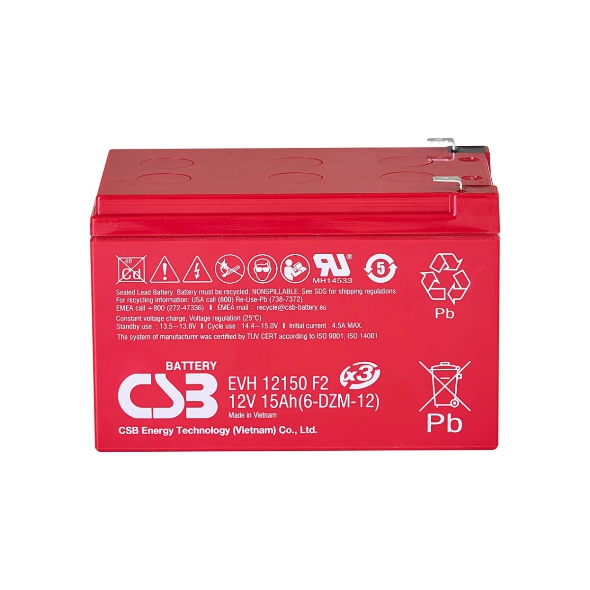EVH12150 12V 15Ah – záložný, bezúdržbový, VRLA, uzatvorený, akumulátor od CSB Battery. Technológia AGM. Určený pre cyklickú prevádzku.
